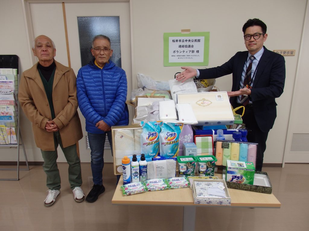 桜井市中央公民館ボランティア部会様より、バスタオルや洗剤・ティッシュ等の日用品類をいただきました。